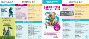Das gesamte Wochenende von Freitag, 7. Juli bis Sonntag, 9. Juli – veranstaltet in Kooperation mit der Stadt Regensburg – steht im und um das Haus der Bayerischen Geschichte im Zeichen des Barock: neben den barocken Lustgärten erwartet die Besucher eine Vielfalt barocker Künstler, Musik von Klassik bis Rock, Theater, Film und spezielle Angebote für Kinder. Darüber hinaus gibt es Freitag, Samstag und Sonntag kostenfreie Führungen durch die Ausstellungen des Hauses der Bayerischen Geschichte.