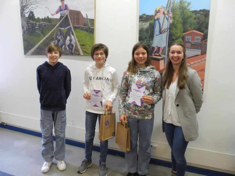 Bericht und Foto: Stadt Regensburg: von links nach rechts: Severin Unger (Bezirkssieger 2023), Hannah Meister und Magnus Fröhlich (Sieger/-in 2024) und Irina Rakos (Leitung Kinderbücherei) © Johanna Sippel