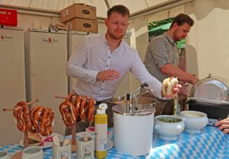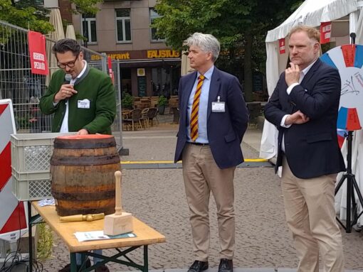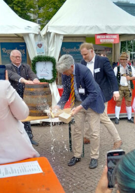 Professor Beckhove übernahm dann auch den Fassanstich. Mit gekonnten zwei Schlägen hieß es „O’zapft is“. Der edle Gestensaft wurde dieses Jahr von den Regensburger Brauereien Kneitinger und Bischofshof (Weltenburger) angeliefert. Der traditionelle Weißwurstfrühschoppen am ersten Festtag war somit eröffnet. Dazu gab es weitere regionale Spezialitäten, wie Bratwürste aus der historischen Regensburger Wurstküche, Knackersemmeln, Obatzda, Brezen und einiges mehr. Mit zünftiger bayerischer Blasmusik von den Labertaler Musikanten war dann eine stimmungsvolle Biergartenatmosphäre gegeben.