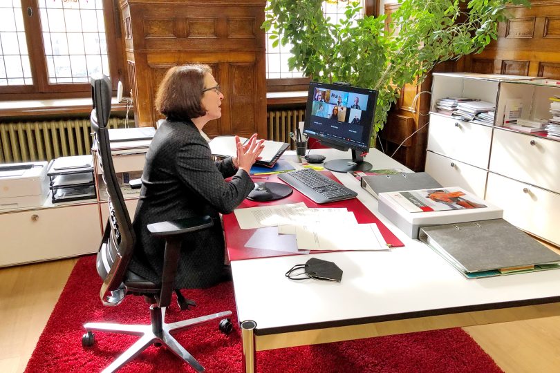 – Oberbürgermeisterin Gertrud Maltz-Schwarzfischer im Video-Call mit Bürgermeister Gennady Trukhanov aus Odessa © Stadt Regensburg, Stephan Rockinger