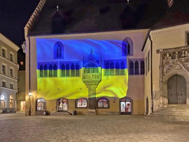 Seit Beginn dieser Woche setzt Regensburg ein weiteres Zeichen gegen den Krieg und für die Solidarität mit der Ukraine: Ab den Abendstunden erscheint die Flagge der Ukraine als Projektion auf der Außenwand des Reichssaals. Weitere Informationen zu Hilfsangeboten für die Ukraine unter https://www.regensburg.de/aktuelles/regensburg-hilft-ukraine