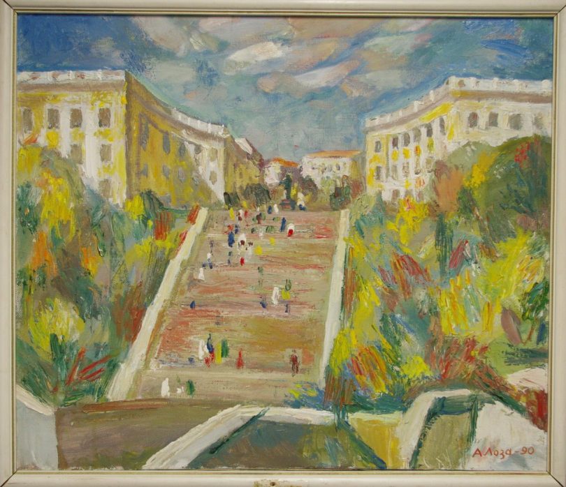 Loza (1931-2004) war Mitglied der Akademie der Wissenschaften der UdSSR. Er hatte die Kunstschule in Odessa besucht und 1966 ein Kunststudium an der Staatlichen Akademie in Charkiv abgeschlossen. Er malte in spätimpressionistischer Weise: Die Potemkinsche Treppe zeigt er im Licht eines Frühherbsttages unter einem wolkigen Himmel mit roten Spuren auf den Treppenstufen, die an Blut erinnern.