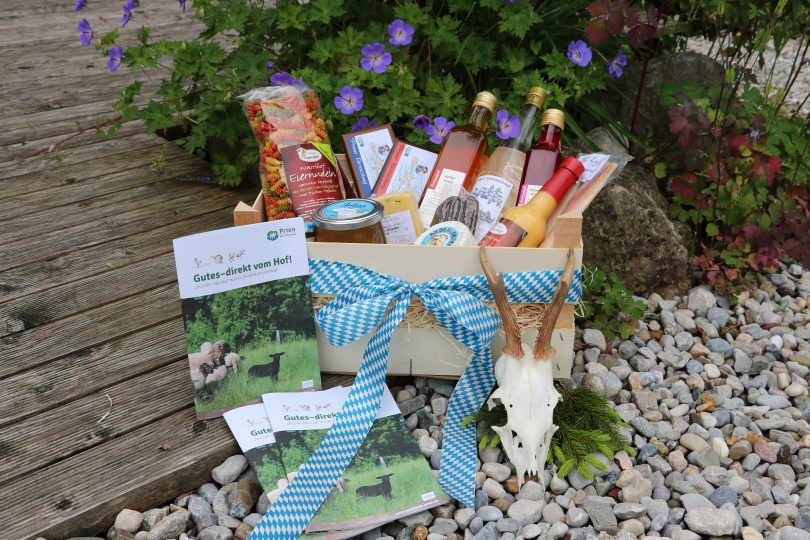 Foto: Prien Marketing Gmbh: Ein Präsentkorb voller regionaler Köstlichkeiten – den Priener Schmankerlkorb gibt es im Regionalmarkt Prien auf Vorbestellung.