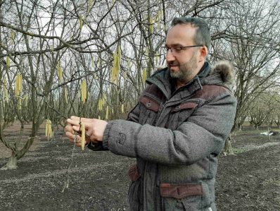 Die Sträucher werden in den ersten Jahren durch gezielten Baumschnitt zu einem Baum mit Krone entwickelt. Diese Arbeit findet in der Regel von Februar bis Mai statt und kann bis zu 8 Minuten je Strauch in Anspruch nehmen. In der Jugendentwicklung kann die Krankheit Pseudonomas Probleme bereiten, die über Frostrisse unter die Rinde und in den Stamm eindringen kann. Um dem entgegen zu wirken, wurden die Stämme mit Kalk weiß angestrichen. Aktuell findet die Blüte der Haselnuss statt. Nach der Bestäubung kann es bis in den Mai dauern, bis die Befruchtung abgeschlossen ist. Ein Hauptschädling ist der Haselnussbohrer, der im Mai die Pflanzen emporklettert. Für Stimmer sind Sorten wichtig, bei denen sich die Nuss leicht von der Hülse trennen lässt, damit die weitere Verarbeitung problemlos läuft. Inzwischen wurde die Technik für Ernte, Wäsche, Sortierung und Kühlung der Früchte selbst angeschafft. Durch die Kühlung können von der Ernte weg bis etwa Weihnachten Frischnüsse angeboten werden. Viele Kunden schwören darauf. Die kleinen Nüsse werden für die Nager-Mischung verwendet, Mittlere von der Schale befreit und die großen Früchte kommen in die Premium Mischung, die für den menschlichen Verbrauch, aber auch für Nagetiere geeignet ist. Die regionalen Nüsse können das ganze Jahr über im Onlineshop www.haselnuss24.de bestellt werden. Insgesamt hat sich die Arbeit auf dem Hof durch die Umstellung von Milchvieh auf Haselnüsse sehr gewandelt. Martin Stimmer verbringt den halben Tag damit, die Bestellungen und Anfragen in Büro zu bearbeiten und die Ware versandfertig zu machen. Die ganze Familie ist dabei mit eingebunden. Erst nach dem Mittagessen ist Zeit für anderen Arbeiten auf seinem Hof, z.B. auf seinen Getreidefeldern.