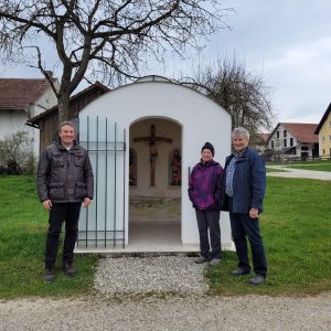 Michael Hamburger und Marliese u. Bartholomäus Bachmaier vor Kapelle (Bildrechte: Michael Hamburger)