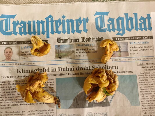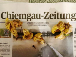 Lang deshalb, weil noch am 12. Dezember – also zwischen zweiten und dritten Advent – bei einem Spaziergang durch die noch milde verschneiten Wälder im Westen der Chiemsee-Region an bislang nicht bekannten Wuchs-Stellen Reherl und kurz darauf Fliegenpilze entdeckt wurden. An beiden Plätzen jeweils mit fünf Exemplaren. Davon diese Bilder und Tageszeitungsnachweise.