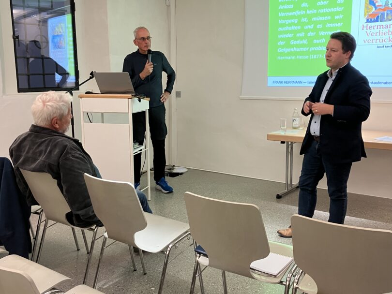 Lung begrüßte alle Anwesenden, darunter auch Bürgermeister Hans Feil aus Laufen, zum Vernetzungstreffen der „Fairtrade Towns“. Der Veranstaltungsort sei nicht zufällig gewählt, sondern er trage die Nachhaltigkeit in sich. Frank Herrmann beleuchtete den Tourismus von allen Seiten und beschrieb dessen Folgen durch den Treibhausgas-Ausstoß sowie den Overtourism (lange Schlangen für ein Foto an einem besonderen Ort). In seiner Präsentation machte er bewusst, dass es Wasser reichlich an Orten mit Touristen (Golfplätze, Hotelpools) gibt, dass es aber für die Einheimischen – etwa in Mallorca – zeitlich rationiert wird. Herrmann listete Probleme, wie Müll, Klimawandel, sowie die Problemzonen Flugverkehr und Kreuzfahrt auf und zeigte dazu deutliche Beispiele von Auswirkungen an Touristenorten.