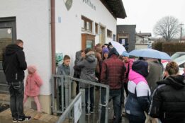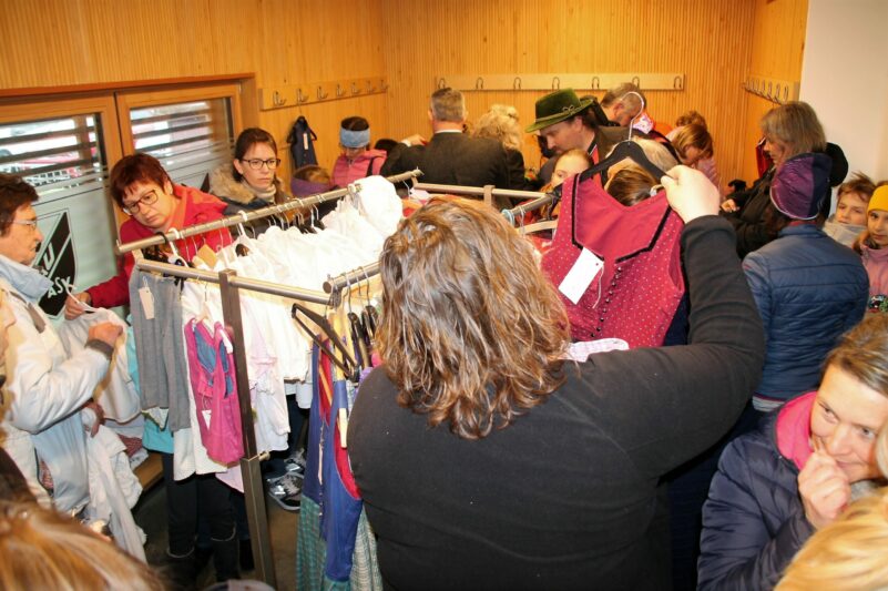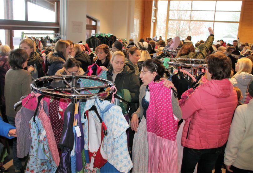 Dank für Aufwand und Mühen waren unzählige Besucher und Kauflustige, die mit Steppjacken und Pudelmützen gegen Schneefall und Nasskalt ausgestattet, riesige Menschenschlangen an den Eingängen bis zum offiziellen Einlass bildeten. Ziel war es, die strukturiert angeordneten Kleiderständer mit gebrauchter, aber auch neuer Trachtenbekleidung für ein adrettes Erscheinungsbild bei den bevorstehenden Festen und Veranstaltungen anzusteuern. Die Auswahl an gut erhaltener und gepflegter Ware war reichlich und lohnte auf jeden Fall für ein erfolgreiches „Gesucht“, „Gefunden“ und „Passt“ nach ein- oder mehrmaligem Schlendern. Großer Andrang herrschte im Raum für Kinderbekleidung mit kurzen Lederhosen zum Plattleln, Haferlschuhen, Hemden und Trachtenwesten für die Buben oder Dirndlgwand, Blusen und Schuhe fürs Drehen der Dirndl. Für viele Mütter war vor allem der Preis entscheidend, sich für ein gebrauchtes Stück zu entscheiden. Ein Kind an der traditionsreichen Brauchtumspflege teilhaben zu lassen, bedeute manche Eltern bei Neubeschaffung entsprechender Bekleidung in renommierten Geschäften oft einen sehr tiefen Griff ins Portemonnaie.