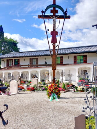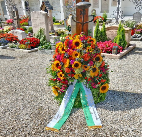 Fotos: Theresa Fritzenwenger, Gaupressewartin Chiemgau-Alpenverband – Blumenkranz zum Gedenken an die Verstorbenen des Festvereins und des Chiemgau-Alpenverbandes im Friedhof von Reit im Winkl