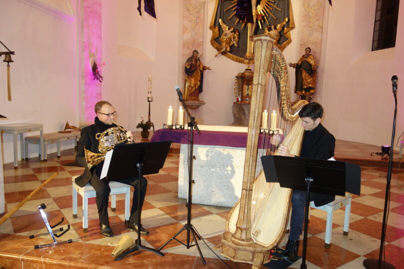 Berührende und beruhigende Klänge gab es zu vernehmen in der Reit im Winkler Pfarrkirche St. Pankratius beim Adventskonzert „A bissl staade Zeit“. Die beiden renommierten Chiemgauer Musiker Hans Niedermaier mit seiner Harfe und Sebastian Krause mit Waldhorn, Naturhorn und Alphorn stimmten mit ruhigen und besinnlichen Werken die vielen Zuhörer auf die Weihnachtszeit ein.