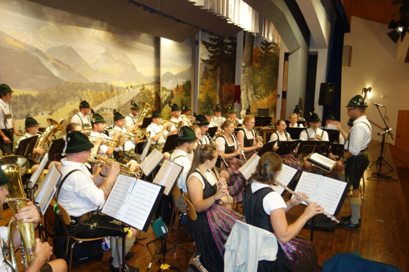 Dabei seien auch einige Stücke mit Gesangseinlagen gewesen, sagte sie und bewies das bei der Polka „Zum Glück gibt’s Blasmusik“ von Mathias Rauch gleich selber mit ihrem Gesangpartner Graz Heigenhauser. Aus der Feder von Martin Scharnagl, dem Dirigenten der Nachbarkapelle aus Kössen, stammt die konzertante, eindrucksvoll gespielte Polka „Ehrenwert“. Getragene Egerländer Blasmusik gab es beim Konzertmarsch Mars der Medici zu hören. Eine historische Tradition hat der darauf folgende Marsch „Jubelklänge“ von Ernst Übel, der auch bei der Krönung von Königin Elisabeth II. am 2. Juni 1953 in London gespielt wurde. Viel Beifall gab es auch für ein Medley von Udo Jürgens mit dessen bekanntesten Hits und für den darauf folgenden Ohrwurm „Siesta“ mit einem Solostück für zwei Trompeten. Dass die Reit im Winkler Musikanten auch eine kräftige Singstimme haben, bewiesen sie bei der Polka „Ein Leben lang“ von den Fäaschtbänklern.