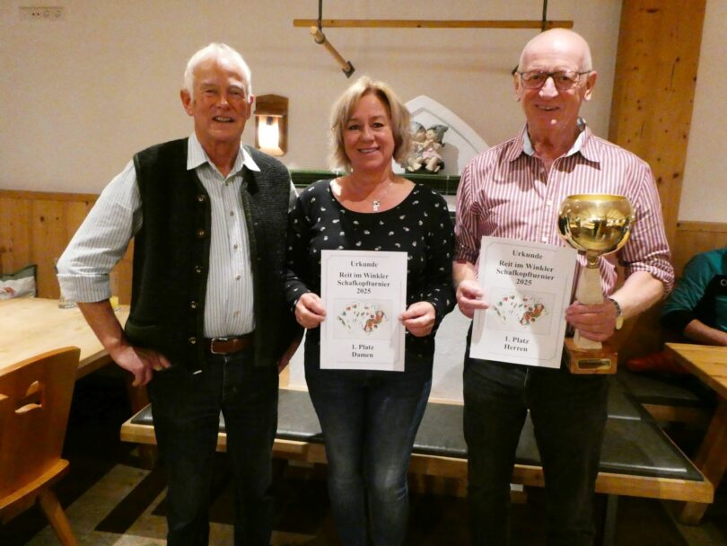 Bericht und Foto: Sepp Hauser – Reit im Winkler Schafkopfmeister 2025 wurden Bernhard Loferer aus Kössen (rechts) bei den Herren und Marion Heistracher aus Reit im Winkl bei den Damen. Auf unserem Bild gratulierte ihnen der Organisator und Spielleiter Hans Strohmayer.