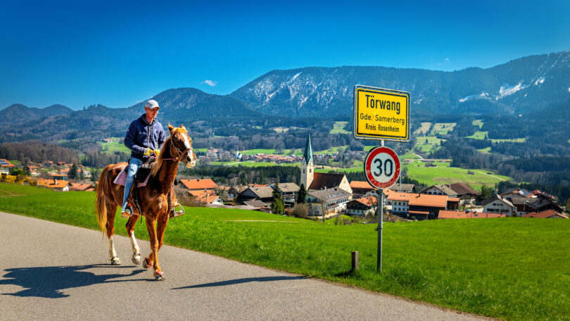 Sanfte Hufschläge hallen über die kleine Straße, während Reiter und Pferd gemächlich durch das malerische Hochtal des Samerbergs ziehen. Vor ihnen erstreckt sich eine beeindruckende Kulisse: Die idyllischen Ortschaften Törwang und Grainbach schmiegen sich an die sanften Hügel, während im Hintergrund die imposante Hochries und der Riesenberg das Panorama dominieren.