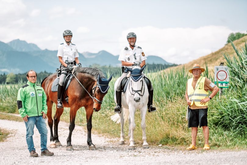 Die Beamten der Reiterstaffel des Polizeipräsidiums Oberbayern Süd beteiligen sich auch dieses Jahr wieder an den gemeinsamen Naturschutz- und Sicherheitsstreifen in Zusammenarbeit mit den Unteren Naturschutzbehörden der Landratsämter sowie den zuständigen Gebietsbetreuern und der Naturschutzwacht. Beispielsweise im „Bergener Moos“, südöstlich des Chiemsees, wird verstärkt darauf geachtet, dass die in der Kernzeit von März bis Ende Juni gesperrten Wege im Wiesenbrütergebiet nicht von Radfahrern sowie Fußgängern bzw. freilaufenden Hunden betreten werden. Durch viele persönliche Gespräche und Aufklärungsarbeit konnten mit den gemeinsamen Kontrollen bereits große Erfolge erzielt werden, wodurch die Belastung in den gefährdeten Gebieten reduziert und das Wiesenbrüterprogramm effektiver durchgeführt und überwacht werden konnte.