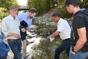 Andreas Philipp (zweiter von rechts) vom Wasserwirtschaftsamt Traunstein erläuterte den Exkursionsteilnehmern, darunter (von links) Lehrer im Ruhestand Johann Baptist Bernhofer, Zweiter Bürgermeister der Gemeinde Unterwössen Johannes Weber sowie Mitglied des Gemeinderats der Gemeinde Unterwössen Matthias Schweigl, beim Vororttermin erste Erfolge der Renaturierungsmaßnahme am Wössener Bach. Bild: Klaus Hellmich.