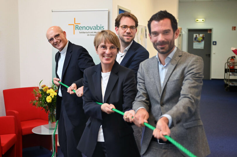 BEricht und Bilder: Renovabis / Matthias Dörr – An einem Strang ziehen die Hilfswerke Misereor und Renovabis künftig in Berlin noch mehr als bisher. Im Rahmen ihrer weltkirchlichen Zusammenarbeit knüpfen die beiden Solidaritätsaktionen der katholischen Kirche in Deutschland am Regierungssitz am Netz der Kooperationspartner mit in- und ausländischen Interessensverbänden und internationalen Staatenvertretungen. Unser Bild zeigt Renate Krekeler-Koch, die Leiterin der neuen Renovabis- Repräsentanz, dahinter Kooperationspartner Jonas Wipfler, den Leiter des benachbarten Misereor-Büros, Renovabis-Aktionsrats-Vize Marc Frings vom Zentralkomitee der deutschen Katholiken (vorne) und Pfarrer Professor Thomas Schwartz, den Leiter des Hilfswerks Renovabis (hinten).