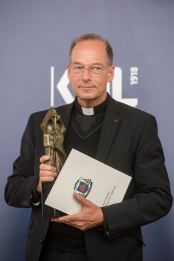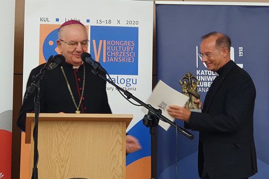 Im Rahmen des VI. Kulturkongresses in Lublin, veranstaltet von der Kath. Universität Lublin, wurde Renovabis-Hauptgeschäftsführer Pfarrer Christian Hartl am 16. Oktober die Auszeichnung “Memoria iustorum” (lat. „Gedächtnis der Gerechten“) überreicht. Sie wird für besondere Verdienste im Bereich des Dialogs und der Versöhnungsarbeit verliehen. Der Preis hat die Form einer Metallskulptur, die den Heiligen Kyrill und den heiligen Method zeigt, die beide Schutzpatrone Europas sind. Der Lubliner Erzbischof Stanisław Budzik betonte in seiner Laudatio, dass die Solidarität und die treue Unterstützung seitens der Solidaritätsaktion Renovabis viele geistige und materielle Früchte in seiner Heimat mit sich gebracht hätten. Dabei handele es sich um Projekte, die nur mit finanzieller Hilfe aus Deutschland möglich gewesen seien, aber auch um Unterstützung beim Aufbau von kirchlichen Strukturen und beim Prozess der Verständigung und der Versöhnung unter den Völkern von Ost und West. Wörtlich heißt es in der Urkunde: “Renovabis war von Anfang an gedacht als eine Antwort auf den gesellschaftlichen und religiösen Neuanfang in den Staaten des ehemaligen Ostblocks nach dem Zusammenbruch der kommunistischen Systeme. Diese Anerkennung gilt allen Mitarbeitern und Mitarbeiterinnen von Renovabis, allen, die die Pfingstaktion unterstützen, der Deutschen Bischofskonferenz, der katholischen Kirche in Deutschland und allen Menschen guten Willens für so viele Zeichen der Solidarität mit den Menschen in Mittel-, Ost- und Südosteuropa.”