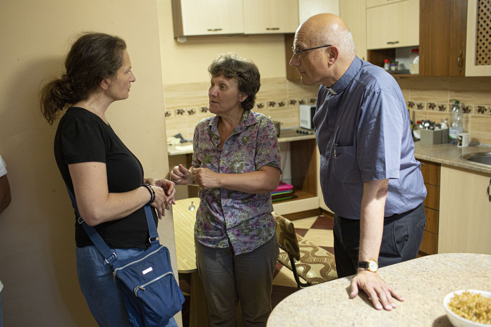 Thomas Schwartz im Gespräch mit Begünstigten der Caritas an einem Transitzentrum in Novovolynsk