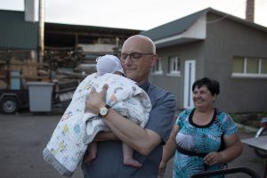 Thomas Schwartz im Gespräch mit Begünstigten der Caritas an einem Transitzentrum in Novovolynsk