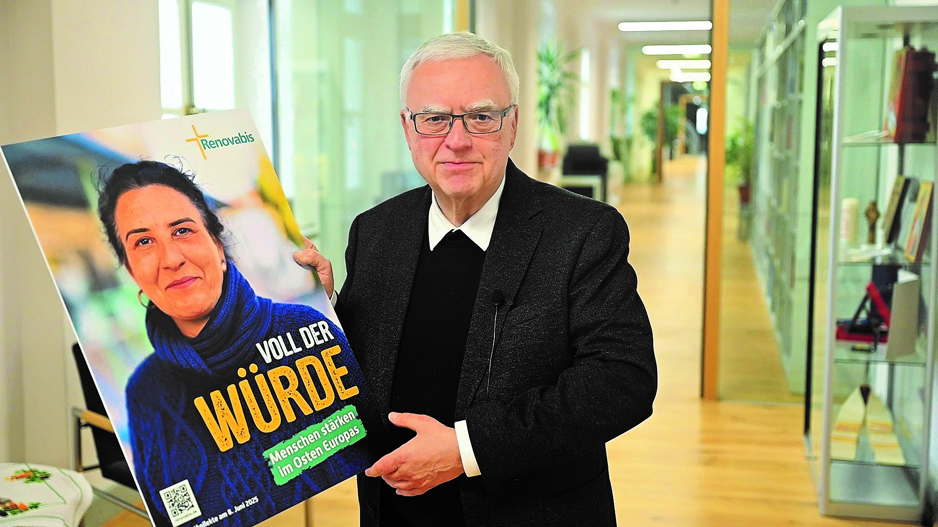 Renovabis-Bischof Heiner Koch ist angetan vom Plakat zur Renovabis-Pfingstaktion. Es zeigt die 56 Jahre alte Elena; sie lebt in Bulgarien und gehört zur Minderheit der Roma. Und sie hat in ihrem Alltag immer wieder Diskriminierung erleben müssen. Es hat den Erzbischof berührt, als er erfuhr, dass die starke Frau als Putzhilfe hart arbeitet, um die kleine Rente ihres Mannes aufzubessern. Unterstützung findet sie in einem Projekt, das von Renovabis getragen wird. Die Hausaufgabenhilfe für ihre Enkelkinder und andere Kinder im Viertel liegt Elena besonders am Herzen. Denn sie glaubt fest daran: Bildung ist der Schlüssel zu einem besseren Leben – zu einem Leben in Würde. Genau dafür setzt sich Renovabis ein. Und darum lautet 2025 das Motto der Pfingstkampagne „Voll der Würde. Menschen stärken im Osten Europas.“ Foto: Renovabis©Simon Korbella
