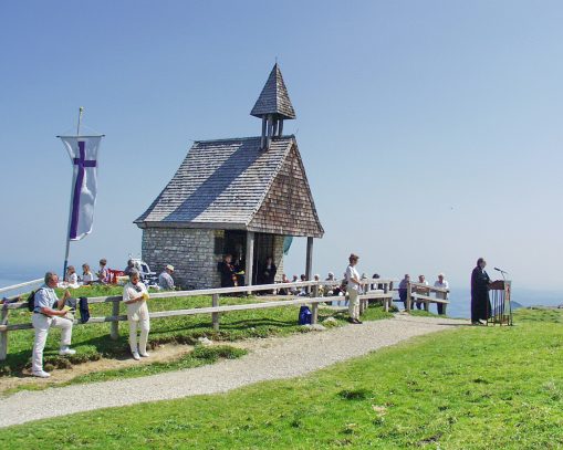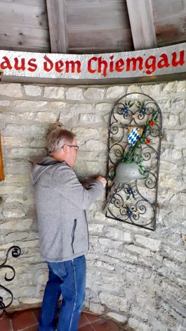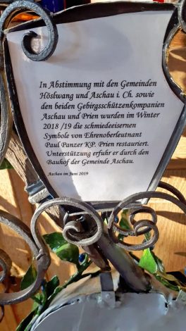 In guter Abstimmung mit den Gemeinden Höslwang und Aschau i. Chiemgau sowie den beiden Gebirgsschützenkompanien Aschau und Prien wurden im Winter 2018/2019 die schmiedeeisernen Symbole in der Steinlingkapelle auf der Kampenwand von Ehrenoberleutnant Panzer von der GSK Prien restauriert. Unterstützt wurde er dabei vom Bauhof der Gemeinde Aschau und von Veteranenvorstand Georg Fischer aus Prien, der sich mit Glasperlen-Sandstrahlen mit ans Reinigungs-Werk machte. Nunmehr wurden die restaurierten Teile mit Herrgott, Karabiner und Helm wieder an ihrem ursprünglichen Ort angebracht. Rund 80 Stunden an ehrenamtlicher Arbeit waren für Paul Panzer und seine Helfer erforderlich, um die Arbeit ganz im Sinne der Gebirgsschützen-Hauptmänner Rudi Holthausen aus Prien und Hubert Stein aus Aschau zu vollenden. Nach dem Anbringen an der Innenwand der Kapelle „Maria, Königin des Friedens“ hatten sich Paul Panzer und Bauhofleiter Rudi Angermaier eine Brotzeit in der nahen Steinling-Alm verdient.