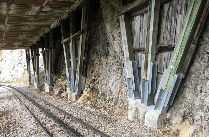 Die Infrastruktur am Wendelstein mit teils über 100 Jahre alten Bauten ist naturgemäß extremen Witterungsverhältnissen ausgesetzt. Insbesondere auf der 7,6 km langen Zahnradbahn-Trasse mit sieben Tunnels, zehn Galerien (zum Schutz vor Lawinen und Steinschlag), 13 Brücken und zahlreichen Stützmauern bedarf es deshalb immer wieder Sanierungs- und Erhaltungsmaßnahmen. An der sog. langen Holzgalerie wurden letztens die Holzabstützungen im Bereich der Betonfundamente durch Stahlstützen ersetzt.