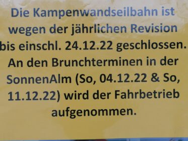 Wegen der jährlichen Revisionsarbeiten bei der Kampenwandbahn Aschau ist bis einschließelich 24. Dezember kein Fahrbetrieb.
