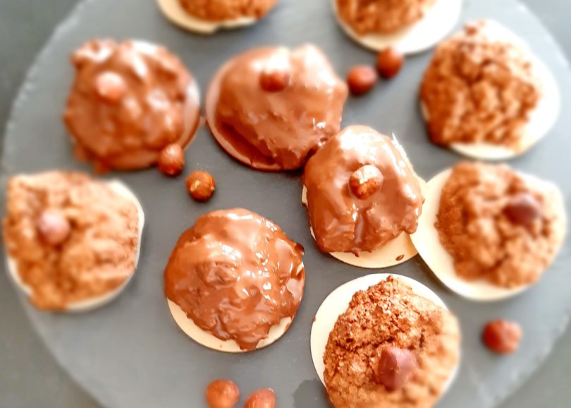 Die Eier mit dem Zucker schaumig rühren, die restlichen Zutaten unterheben, auf Oblaten streichen (mind. 1 cm Rand lassen), in die Mitte eine ganze Haselnuss setzen, im gut vorgeheiztem Ofen 5 Min. bei 220 Grad anbacken, bei etwas niedrigerer Temperatur fertig backen. Für Lebkuchenwürfel: Teig auf ein mit Backpapier belegtes Blech streichen, Würfel schneiden, mit Schokolade glasieren, erkalten lassen, nachschneiden, fertig…schmecken sehr gut…!!!