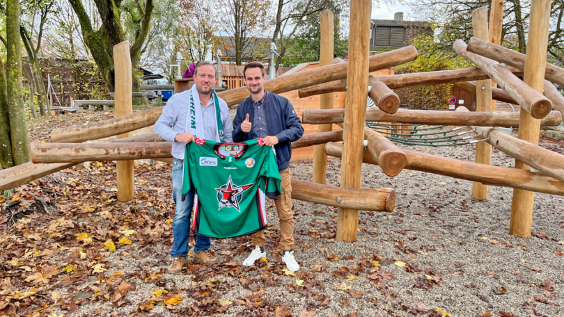 Julian Richter gemeinsam mit Darwin Kuhn auf dem Gelände der Richter Spielgeräte GmbH. / Copyright: Starbulls Rosenheim e.V.