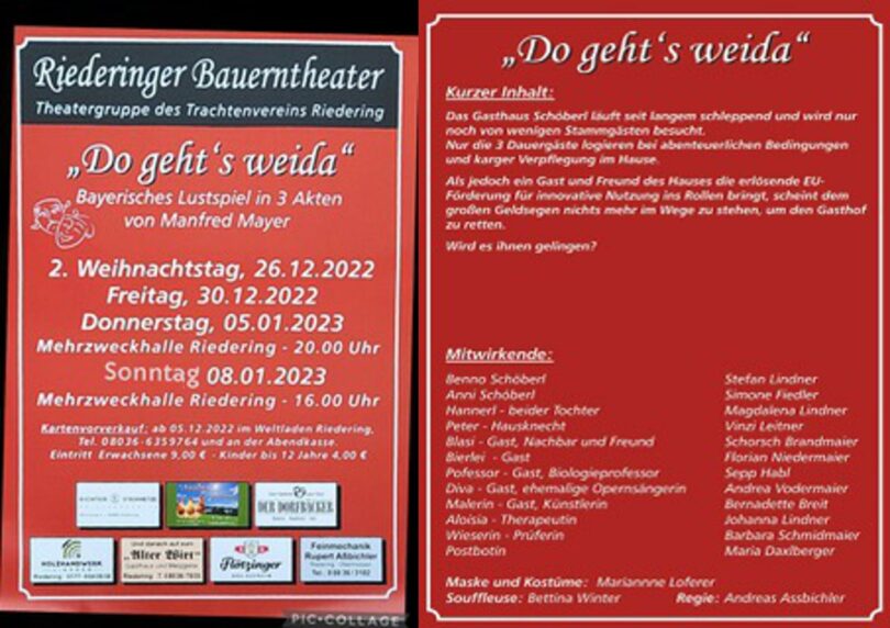 Die Theatergruppe vom Trachtenverein Riedering bringt zur heurigen Weihnachtszeit das heitere Lustspiel “Do geht´s weida” in drei Akten zur Aufführung. Premiere ist am zweiten Weihnachtsfeiertag, 26. Dezember um 20 Uhr in der Mehrzweckhalle von Riedering.