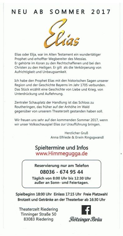 Neu ab Sommer 2017 wird im Theaterzelt in Riedering das Stück „ELIAS“ gespielt – Premiere ist am Freitag, 26. Mai um 18 Uhr. Termine zum Spiel des wundertätigen Propheten und weitere Informationen gibt es im Internet unter www.himmegugga.de. Reservierungen sind nur am Telefon täglich von 8 Uhr bis 12.30 Uhr (ausser an Sonn- und Feiertagen) unter 08036-6749544 möglich. Spielbeginn ist immer um 18 Uhr, Einlass ist ab 17.15 Uhr bei freier Platzwahl. Brotzeit und Getränke an der Theaterbar gibt es ab 16.30 Uhr.