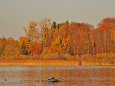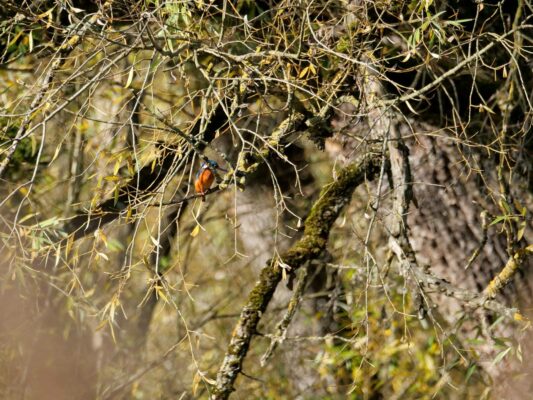 Im November dreht das Wetter noch einmal richtig auf. Bei strahlendem Sonnenschein blinzelt die Sonne wunderbar durch den schönen Auwald. Am Uferrand konnte ich ein Teichhuhn entdecken, während sich der zweite Vogel etwas versteckter hielt. Bei genauem Hinschauen erkennt man eine Bekassine. In den bunten Herbstblättern bringt der Eisvogel eine zusätzliche, schöne Farbe ins Spiel – ein wunderbares Bild.