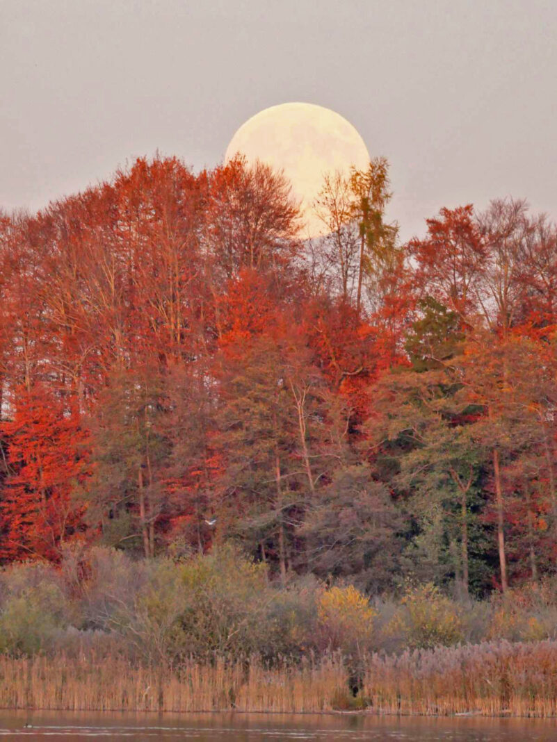 Zum Abschluss erhob sich der riesige Vollmond hinter der herbstlich glühenden Landschaft, während die Sonne unterging. Der Mond steht dieser Tage besonders nah an der Erde, und der kleine weiße Fleck daneben entpuppt sich als eine schöne Kornweihe. Damit sind bereits die ersten Überwinterer aus dem hohen Norden eingetroffen.