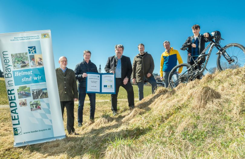Bericht und Foto: LAG Chiemgauer Seenplatte – Rimstings Bürgermeister Andreas Fenzl erhält den Förderbescheid aus der Hand des 1. Vorsitzenden der LAG Chiemgauer Seenplatte, Sepp Reithmeier. Von links: Johann Kölbl, LEADER-Koordinator am AELF Rosenheim – Bürgermeister Andreas Fenzl, 1. Vorsitzender Sepp Reithmeier und Manager Christian Fechter, LAG Chiemgauer Seenplatte, Grundstückseigentümer Fedor Volckmar-Frentzel, Dirtbiker Rio Wolf. Foto Berger Prien.