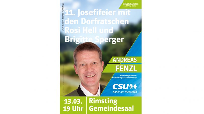 Auch dieses Jahr lädt die CSU Rimsting zur Josefifeier ein. Am Freitag, den 13. März 2020 ab 19.00 Uhr sorgen die „Dorfratschen“ Rosi Hell und ihre Schwester Brigitte Sperger für gute Unterhaltung. Veranstaltungsort ist der Gemeindesaal Rimsting.