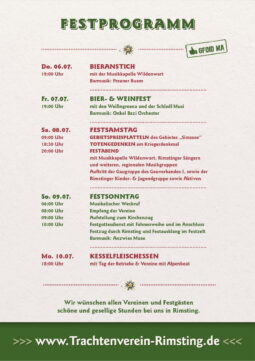 Anlässlich des 100. Geburtstags des G.T.E.V „Ludwigshöhe“ Rimsting wird vom 06.07.2023 – 10.07.2023 in Rimsting mit einem Gebietsfest des Gebiets Simsee würdig gefeiert.