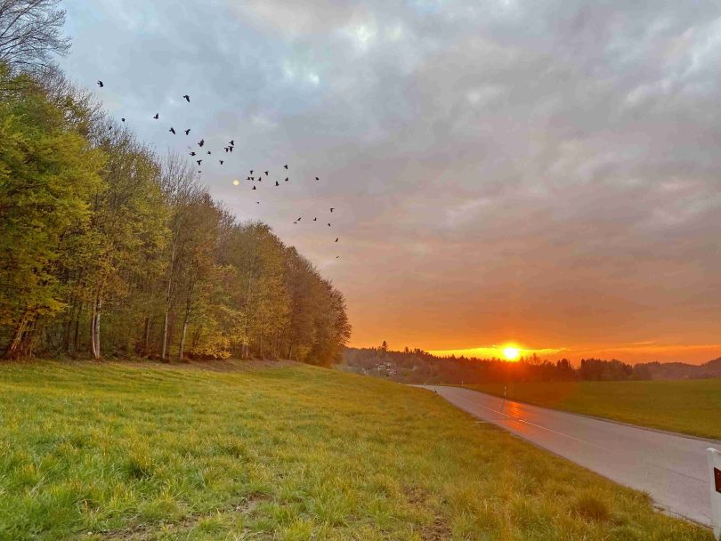 In diesen Frühlingstagen auf dem Weg zum Sommer ist es von schönem Vorteil, wenn man zur richtigen Zeit an den richtigen Plätzen ist – besonders dann, wenn man sich an farbenstarken Sonnenuntergängen erfreuen möchte – wie diese aktuellen Aufnahmen von einer Fahrt von Rimsting über Greimharting nach Prien-Mupferting zeigen.
