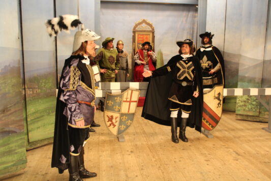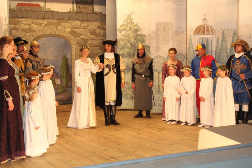 Ein weiterer Höhepunkt der Aufführung war das eindrucksvolle Bühnenbild auf der barocken Drehkulissenbühne der Comedihütte. In minutiöser Handarbeit verwandelten sich die Kulissen mit präzisem Wechsel in Burgräume, Turnierplätze und Sakralräume. Die detailreichen Kostüme spiegelten die soziale Stellung der Figuren authentisch wider und trugen ebenso zur Atmosphäre bei wie die stimmungsvolle Livemusik der Musikkapelle Kiefersfelden. Der eigens arrangierte Chorgesang des hauseigenen Ensembles rahmte die zentralen Szenen eindrucksvoll und verlieh der Aufführung zusätzliche emotionale Tiefe.