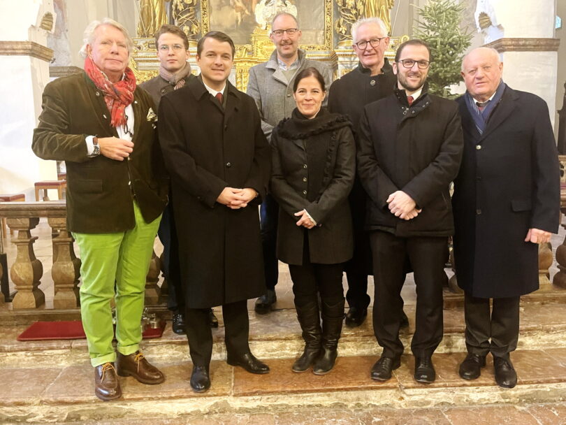 Foto: Hötzelsperger – Neumitglieder vom Bayernbund Kreisverband Rosenheim im Münster von Frauenchiemsee –   von li nach re Dr. Ansgar Sommer, Jakob Buys, Dr. Kurt Berek Bezirkshauptmann Kufstein, Georg Rothbucher, Alexandra Rothbucher, Manfred Karl (2. Vorsitzender), Mitglied des Tiroler Landtags und Vize-Bürgermeister von Ebbs Sebastian Kolland und Christian Glas (Kreisvorsitzender).