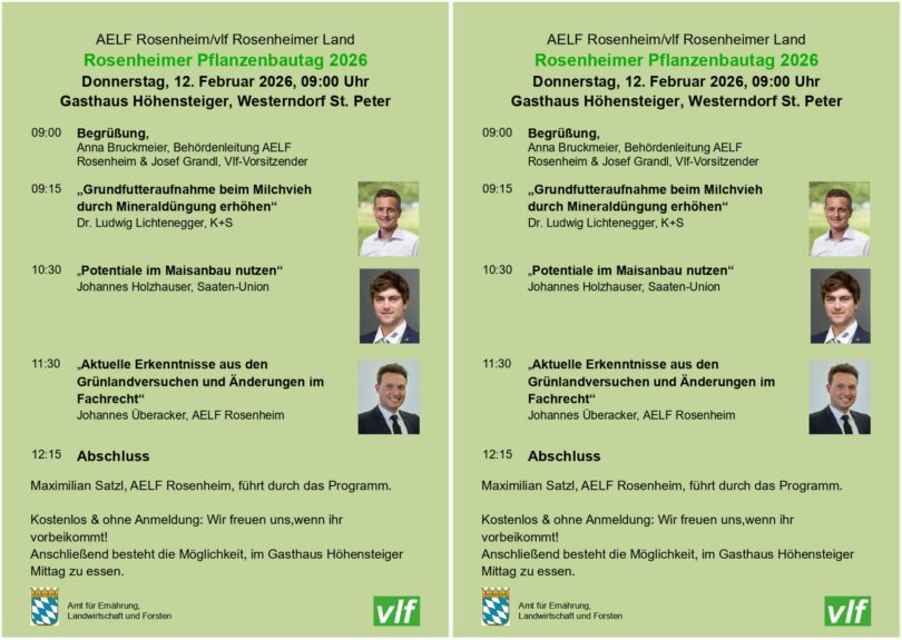 Das Amt für Ernährung, Landwirtschaft und Forsten (AELF) Rosenheim und der vlf Rosenheimer Land laden zum traditionellen Pflanzenbautag ein. Dieser findet am Donnerstag, den 12. Februar im Gasthaus Höhensteiger in Westerndorf St. Peter, statt. Beginn ist 9:00 Uhr.