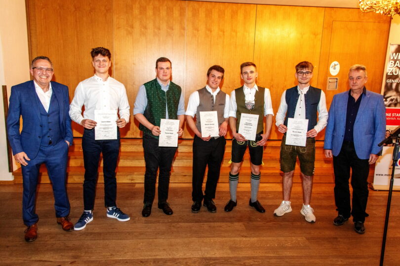 Ein besonderer Moment der Veranstaltung war die Ehrung von Alois Guggenbichler, der sich nach langjähriger Tätigkeit aus dem Prüfungsausschuss verabschiedet. Sein Engagement wurde mit großem Applaus gewürdigt. Für die feierliche Übergabe der Gesellenbriefe sowie die Überreichung der Zeugnisse wurde von den beiden Prüfungsausschussvorsitzenden Ralph Seifried und Volker Mühsam vorgenommen. Die besten Absolventen wurden für ihre herausragenden Leistungen mit Urkunden und Geschenken ausgezeichnet: Prüfungsbester bei den Metallbauern war Maximilian Guggenberger (Metallbau Philipp Krause, Schechen) mit 95 Punkten und der Note 1,3. Er erhielt zudem die Auszeichnung als Praxisbester mit 99 Punkten. Zweitbester war Simeon Jarschel (Metallbau Wölfl & Schnaubelt, Raubling) mit 89 Punkten und der Note 1,7, gefolgt von Florian Keser (Metallbau Reich, Großkarolinenfeld) mit 88 Punkten und der Note 1,8.
