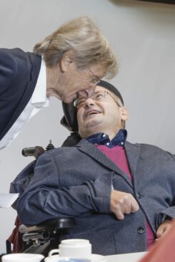 Daniel Artmann, Mitglied des Bundestages, konnte von seiner ganz besonderen Beziehung zur Schießstattstraße in Rosenheim berichten. Sein Engagement für Menschen mit Behinderungen begann vor inzwischen vielen Jahren „als junger Wilder“ im sogenannten Cafe Grenzenlos, einem festen Treffpunkt in der Betreuten Wohnanlage.  Ihm lag der persönliche Kontakt mit Menschen mit Behinderung besonders am Herzen, weil er letztlich erst das Verstehen fördere.Quer durch die Feierlichkeiten zogen sich eine Reihe von Filmausschnitten, die begannen mit der Idee der Betreuten Wohnanlage. Es folgten die Vorbereitung und Gründung der Maria Bergmann Stiftung, Einblicke in das Geschehen, die Aktivitäten in der Schießstattstraße, – maßgeblich finanziell mitgetragen durch Verein und Stiftung, bis hin zu den ganz aktuellen Hilfeleistungen der Maria Bergmann Stiftung. Dr. Sebastian wurde schließlich noch durch einen eigenen Film portraitiert. Seine herausragenden Verdienste wurden mehrfach gewürdigt, er ist der Gründer der Maria Bergmann Stiftung und zudem mit einer äußerst großzügigen Geldeinlage der Motor des Geschehens der Stiftung und damit zugleich wichtigster Förderer des Vereines.