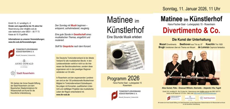Die Matineen im Künstlerhof werden unterstützt von der Stadt Rosenheim und der Anne-Oswald-Stiftung. Informationen und Flyer sind auf der Website des Tonkünstlerverbands Südostbayern www.tkv-sob.de/veranstaltungen/ zu finden. Reservierung per mail über info@tkv-sob.de oder Telefon 08031-807773. Kasse ab 10.15 geöffnet.