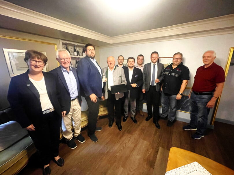 Foto: Hötzelsperger – Übergabe eines Laptops an Kreisvorsitzenden Christian Glas (Mitte mit Laptop) durch Firmeninhaber Maximilian Gilg (li. davon) und Mitarbeiter Manuel Rinderle (re. davon) im Kreise der Kreisvorstandschaftsmitglieder vom Bayernbund Rosenheim.