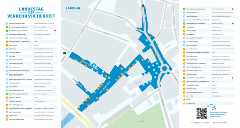 Am 17. Mai 2025, um 11.00 Uhr, wird Staatsminister Joachim Herrmann den 13. Bayerischen Landestag der Verkehrssicherheit eröffnen. Bis 18.00 Uhr steht Rosenheims Innenstadt ganz im Zeichen der Sicherheit im Straßenverkehr. Mit 50 Ausstellern erwarten die Besucher verschiedenste Attraktionen und Aktionsflächen. Das umfangreiche Angebot lädt im gesamten Innenstadtbereich Jung und Alt aktiv zum Mitmachen und Ausprobieren ein.