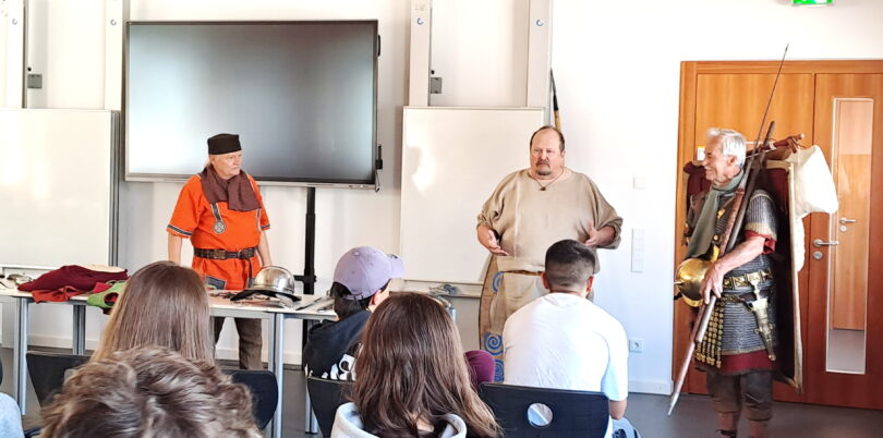 Bevor sich die Schüler alle mitgebrachten Gegenstände, darunter auch viel in mühsamer Handarbeit Gefertigtes, aus der Nähe betrachten und in die Hand nehmen durften, waren noch zwei Freiwillige gesucht. Eingekleidet in Stola und Tunika machten sie als Römerin und Römer eine kurze Zeitreise in die Vergangenheit. Ein abwechslungsreicher Vormittag mit vielen informativen Details. Antike zum „Begreifen“. Auch für nächstes Schuljahr ist ein Besuch der Legio II am LTG Prien fest eingeplant.