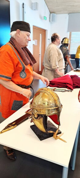 Doch zurück zum römischen Legionär. Dieser trug 32 kg Ausrüstung mit sich, wie uns Hans Ehgartner vorführte. Ein wahrer Kraftakt, den er selbst schon ausprobiert hatte. Ein Jahr intensives Training war zur Vorbereitung nötig. Er erzählte auch, dass bei diesem Experiment 8 Männer in einem Zelt von 3×3 Metern Größe übernachteten. Dabei diente der umgedrehte Schild als Schlafstätte, um damit etwas Privatsphäre zu seinem Nachbarn zu wahren. Immer wieder wurde auch auf die Entwicklung der Waffen im Laufe der Zeit und die Unterschiede zwischen römischer und keltischer Bewaffnung und Kampfestechnik hingewiesen. So diente z. B. das Schwert, das im Laufe der Zeit immer länger wurde, bei den Römern ausschließlich als Stichwaffe, während es bei den Kelten für Hiebe genutzt wurde. Im Schatz der Gäste befanden sich auch einige Originalmünzen sowie Repliken unterschiedlichen Wertes, die herumgereicht wurden. Dabei wurde das unterschiedliche Gewicht deutlich, welches nicht nur der jeweiligen Größe, sondern auch der Tatsache geschuldet war, dass Münzen zum Teil nicht aus reinem Silber bestanden, sondern nur versilbert waren.