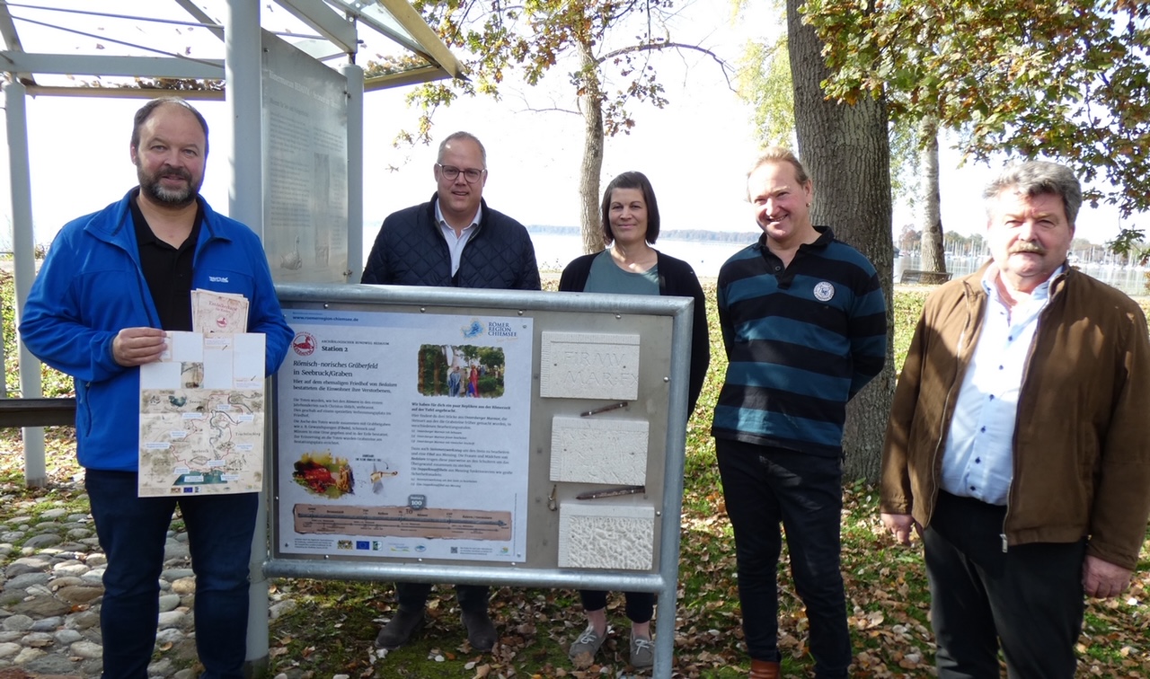 Über die neue Kinder-Infotafel am römisch-norischen Gräberfeld in Seebruck (Ortsteil Graben) freuen sich der gemeindliche Römerbeauftragte und Museumleiter Matthias Ziereis (von links), Bürgermeister Martin Bartlweber, die Projektbeauftragte der Koordinationsstelle „Römerregion Chiemsee“ und provinzialrömische Archäologin Andrea Krammer, Kunstschmied Robert Mayer und der 1. Vorsitzende der Lokalen Aktionsgruppe (LAG) Chiemgauer-Seenplatte Sepp Reithmeier. An sieben weiteren Stationen des gemeindlichen archäologischen Rundwegs sind solche einladenden Kindertafeln mit kurzen, leicht verständlichen Texten, Bildern und originalgereuen Repliken zum Anfassen aufgestellt worden. Die Maßnahme läuft unter dem erfolgreichen Projekt „Römerregion Chiemsee“. Foto: Markus Müller