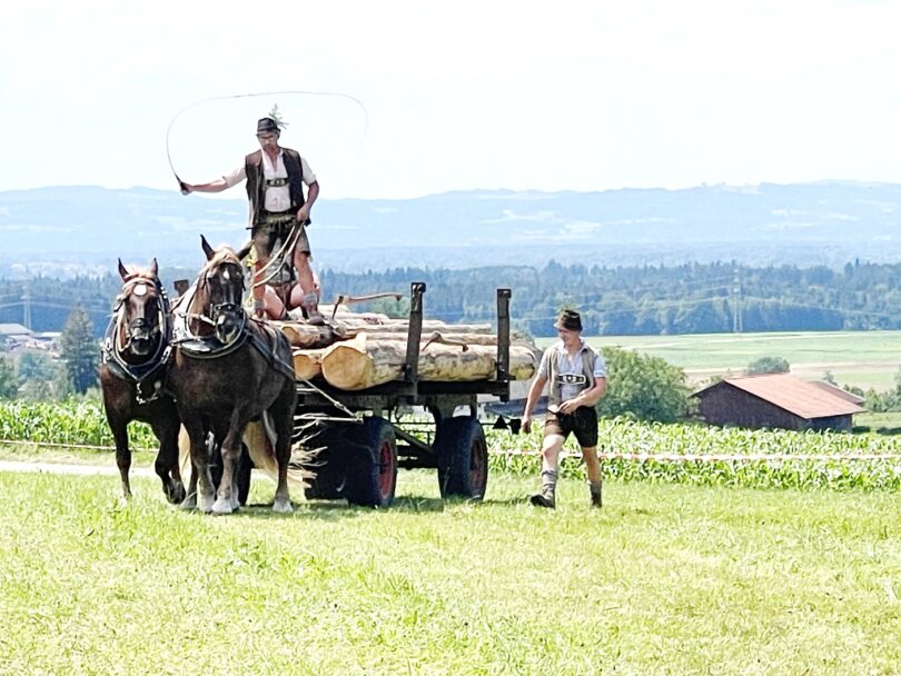 Ganztägig waren Festzelt- und Wiesenplatz eine Augenweide für Liebhaber von Trachten, heimischem Handwerk und Freunde der Landwirtschaft. Besonders die Rosserer präsentierten historische Arbeitsweisen beim Transport von Holz. Sepp Furtner erläuterte bei der Vorführung, wie es früher war, als es noch keine Bulldogs für das Heimbringen der zuvor mit Handarbeit gefällten Baumstämme gab. Mit dabei waren unter anderem Sebastian Ruhsamer aus Söllhuben mit einem Minigespann und Hans Wallner aus Prien, der zudem an die Tradition der Goaßlschnalzer erinnerte. Eine weitere Erinnerung an frühere Arbeitsweisen war ein Wagen mit ryhthmischem Dreschen des Getreides per Hand. Eine besondere Freude hatten Kinder und Jugendliche, die einen kleinen Ausflug auf einem Almkarren mitmachen durften, der von Pferden gezogen wurde.
