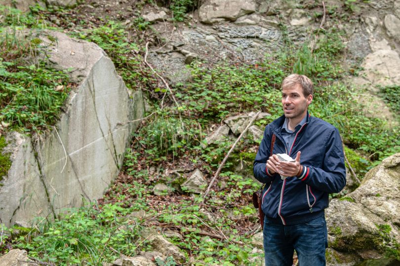 Entdeckt wurde er, das scheint sicher, um 1800 herum vom Rohrdorfer Steinmetz Ignaz Gris. Schon wie er ihn gefunden hat, ist aber fraglich: Der Stein steht nirgends an der Oberfläche an, ist vielmehr von Schichten aus mergeligem Material überdeckt. Man muss also in die Tiefe gehen, um auf ihn zu stoßen. Das sei beim Bau der Soleleitung von Traunstein nach Rohrdorf passiert, so heißt es, doch die verwirklichte Soleleitung scheint Rohrdorfer Gemeindegebiet gar nicht berührt zu haben. Gab es Voruntersuchungen, bei denen der Stein entdeckt wurde? War es beim Anlegen einer schlichten Wasserleitung für einen der Höfe in der Nähe der Steinbrüche? Man weiß es nicht.